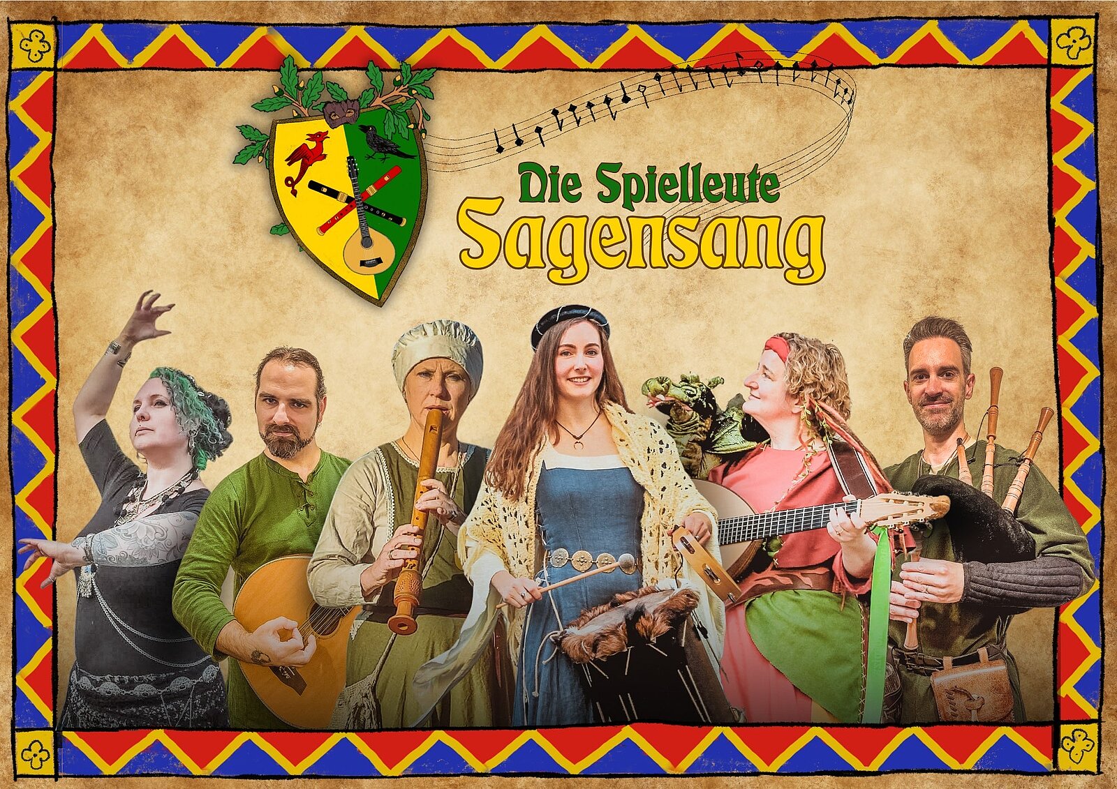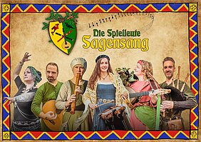 Auf der Bühne stehen die Spielleute “Thuras Math” und “Sagensang”, auf Tischen und Bänken agiert Gaukler Oskar.