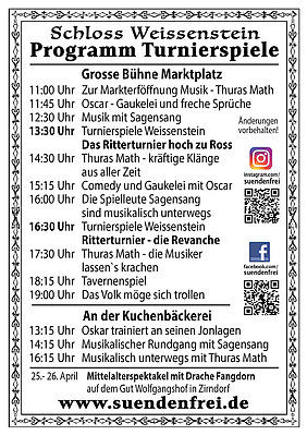 Schon die barocken Vorfahren hatten Spaß daran, die ritterlichen Tugenden zu erhalten und so war es selbst in der Renaissance und im Barock nicht außergewöhnlich, wenn zur Kurzweil und Erheiterung sogenannte Turnierspiele abgehalten wurden. Gleiches erwartet die Gäste an diesem Aprilwochenende im Park von Schloss Weißenstein. Zwei Mal am Tage steigen die edlen Ritter auf die Pferde und liefern sich packende Duelle beim Lanzen- oder Ringestechen. Umrahmt werden diese Shows von einem unterhaltsamen Musik- und Gaukeleiprogramm für die ganze Familie und von einem Markttreiben mit Handel, Handwerk und uriger Gastronomie.
