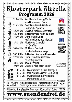 An die fünfzig Handwerker- und Krämerstände, Tavernen, Bäckereien und Brätereien umrahmen das Turniergeschehen und laden zum Verweilen ein. Der Besuch der Klosterstätten, der Wettiner Fürstengruft und des romantischen Landschaftsparks ist im Eintritt inklusive und lohnt auf jeden Fall.
