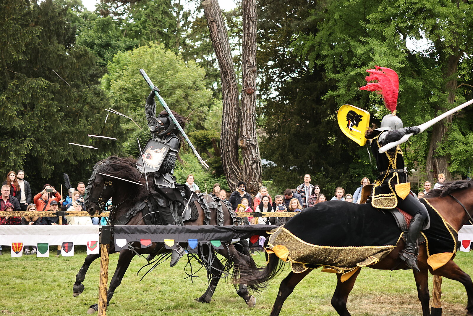 In diesem Jahr dürfen wir einen Wettkampf hoch zu Ross mit den Experten um Stefan Kaiser, gebürtig aus einer Zirkusdynastie, ankündigen. Beim Lanzenstechen der letzten Ritter der Erdenscheibe auf der Turnierbahn wird um Ruhm und Ehre gestritten. Drei zerborstene Lanzen bedeuten den Sieg im Duell. Doch zuvor müssen die edlen Recken so manche Geschicklichkeitsübung absolvieren. Die Zuschauer können aus sicherer Entfernung zuschauen und zujubeln. Zweimal am Tag steigen die Reiter in die Sättel, jeweils um 13:00 und 16:30 Uhr, um auf der großen Turnierbahn ihre Kräfte zu messen und flotte Sprüche zu klopfen.