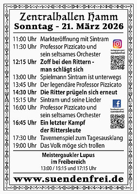 Hier treffen Händler der Mittelalter-, LARP- und Fantasyszene nach dem Winterschlaf auf neugieriges Publikum. Die Besucher dürfen dabei sein, wenn über fünfzig Stände ihre Waren verkaufen und die Neuheiten der Saison Anno 2026 präsentieren. Kleidung, Tücher, Lederwaren, Schuhe, Filzwaren, Fantasy- Schmuck, Seifen und Düfte, Eisenwaren wie Rüstungen, Schlösser und Küchengeräte, Holzwaren, Erzeugnisse aus Horn und Knochen, Felle, Spielwaren, Musikinstrumente, Hüte und Mützen, Papiere und Bücher, Gemälde und Zeichnungen. Fast alles ist handgemacht und mutet an, als wäre es ein paar hundert Jahre alt oder aus einer anderen Welt.