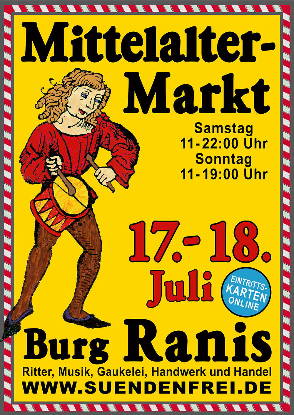 Ein buntes Programm entführt in die Zeit der Minnesänger und Ritter. Mit dabei sind das "Duo Pampatut", Feuergaukler und Fakir Rothar, der Zauberer und Sprücheklopfer Orlando von Godenhaven und die Rapauken. Es versteht sich von selbst, dass auch Ritter nicht fehlen dürfen.