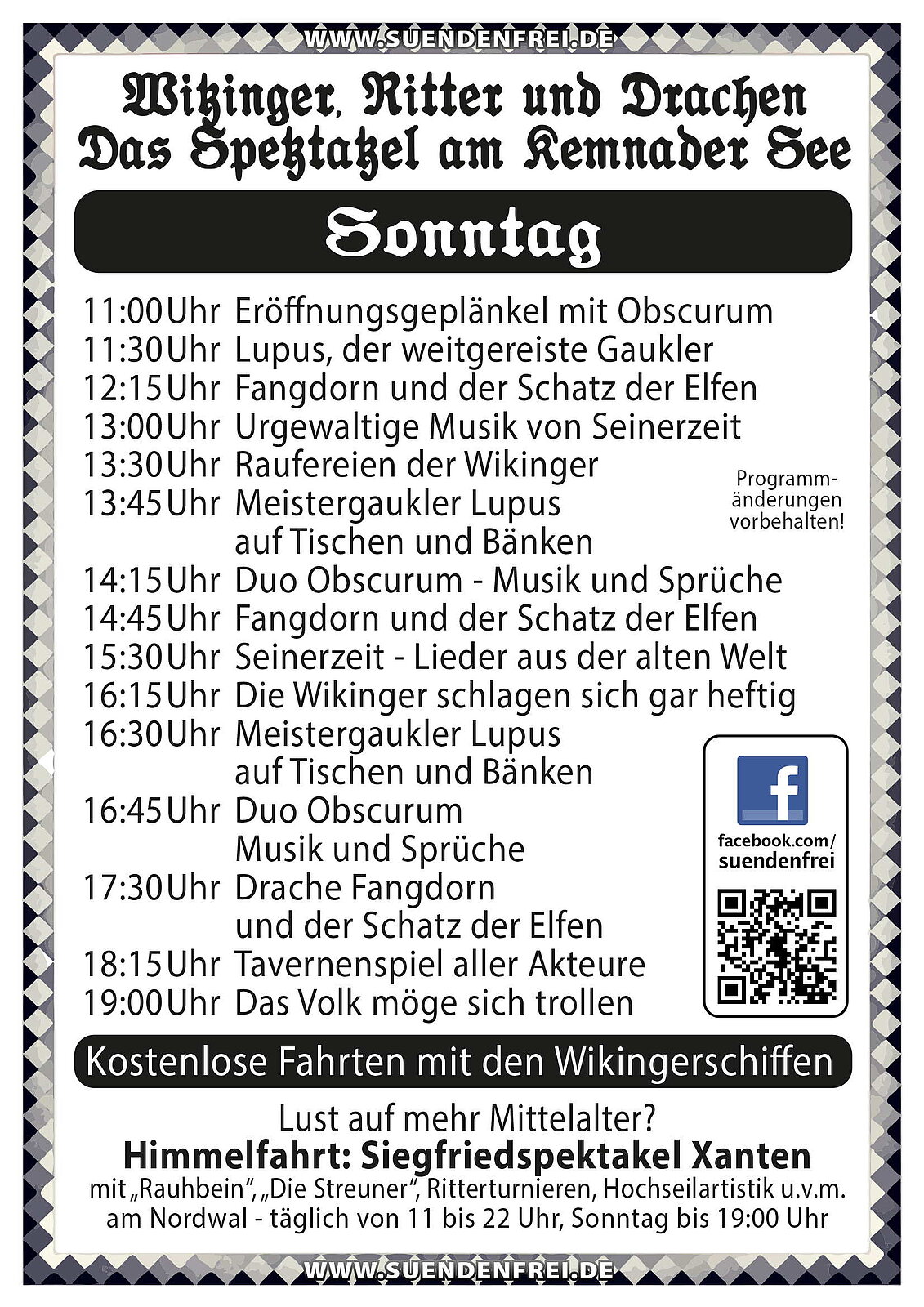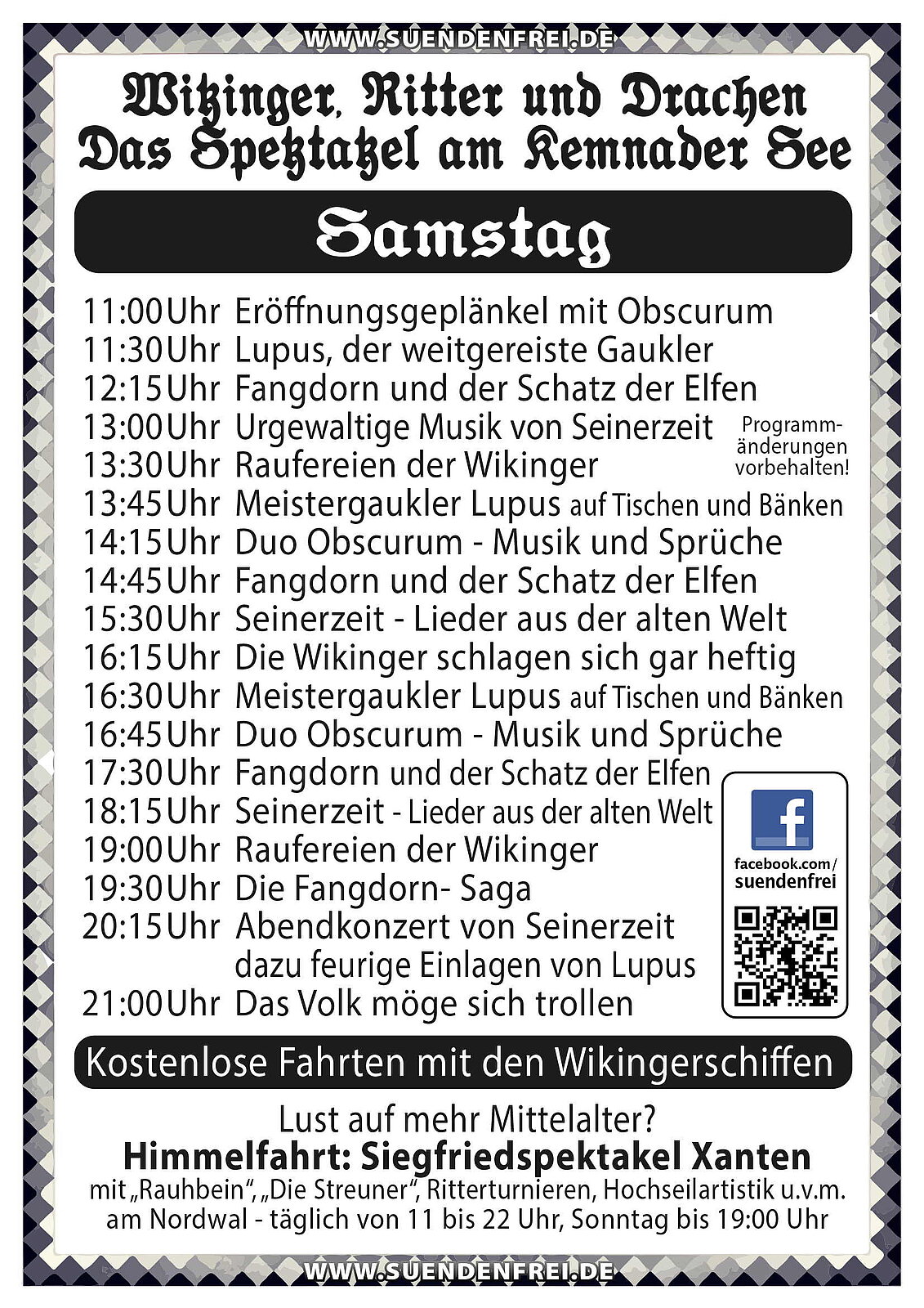 Für die Seefahrer unter Euch liegen wieder Wikingerschiffe zum kostenlosen Mitfahren vor Anker. Bands spielen auf, Feuergaukler Lupus treibt Unsinn und Wikinger hauen von Zeit zu Zeit drauflos. Sehr zur Freude der staunenden Kinder. Die Musik zum Spektakel kommt von den Bands "Seinerzeit" und "Duo Obscurum", Gaukler Lupus und vielen anderen.