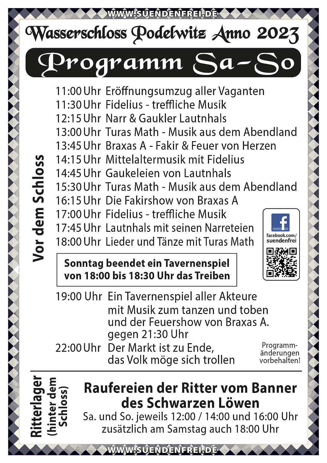 Im Programm stehen die Spielleute "Fidelius" und "Thuras Math", Gaukler und Sprücheklopfer Lautn Hals und die Artistin und Feuerkünstlerin Braxas A. Wir versprechen eine lustige Mischung, die auch am Abend feurige Eindrücke hinterlassen wird. Zur Freude der Kinder greifen die Ritter aller zwei Stunden zu Schwert und Schild, um sich zu raufen.