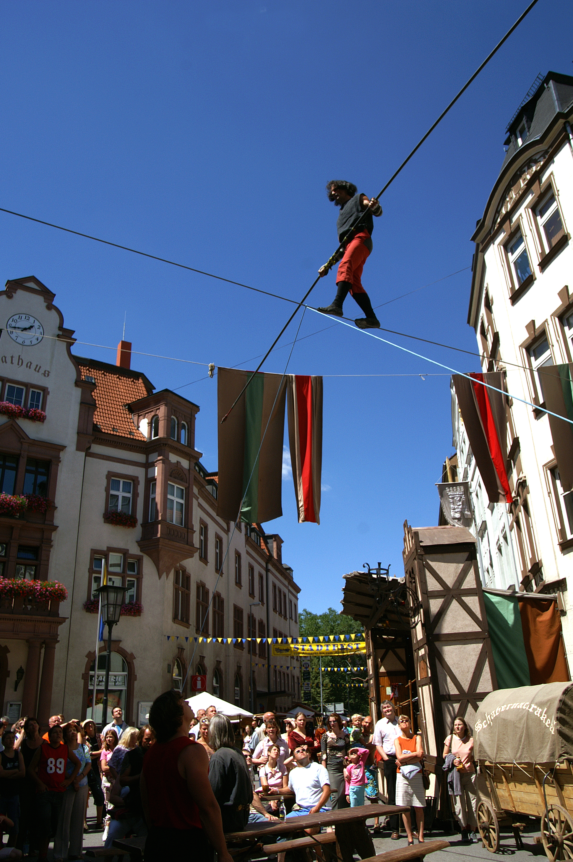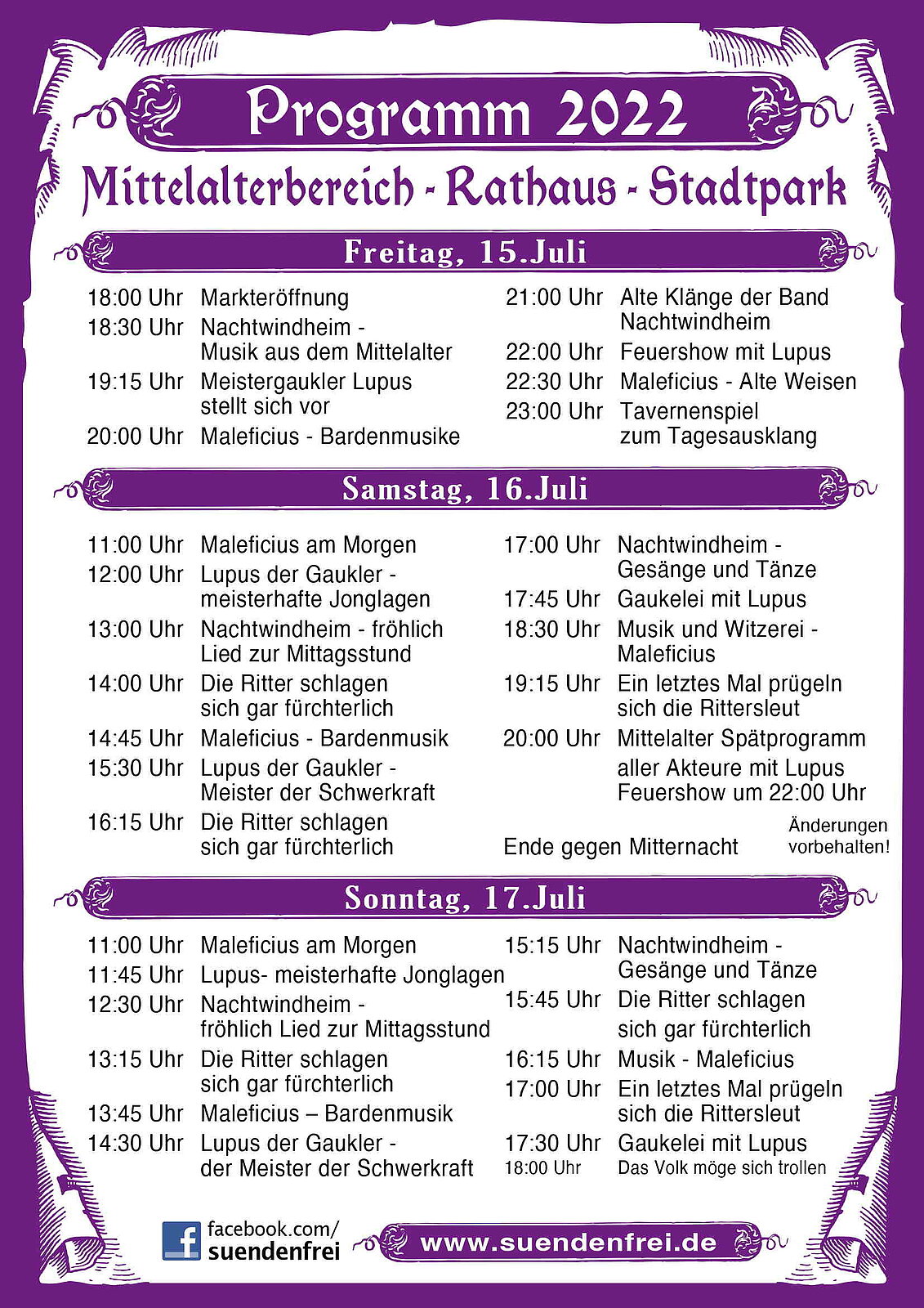 In diesem Jahr laden zwei Bereiche ins Mittelalter. Die Bühne an der Ecke zur Lessingstraße vor dem Rathaus ist der erste und bereits bekannte Bereich. Hier werden wir wie früher eine kleine Bühne errichten und mit Taverne, Bäckerei und Fladenbrot unsere Gäste beköstigen. Dazu gehört auch mittelalterliche Unterhaltung: die musikalischen Schwerenöter von Maleficius, die Spielleute Nachtwindheim und Gaukler Lupus werden sich drei Tage lang die Ehre geben.