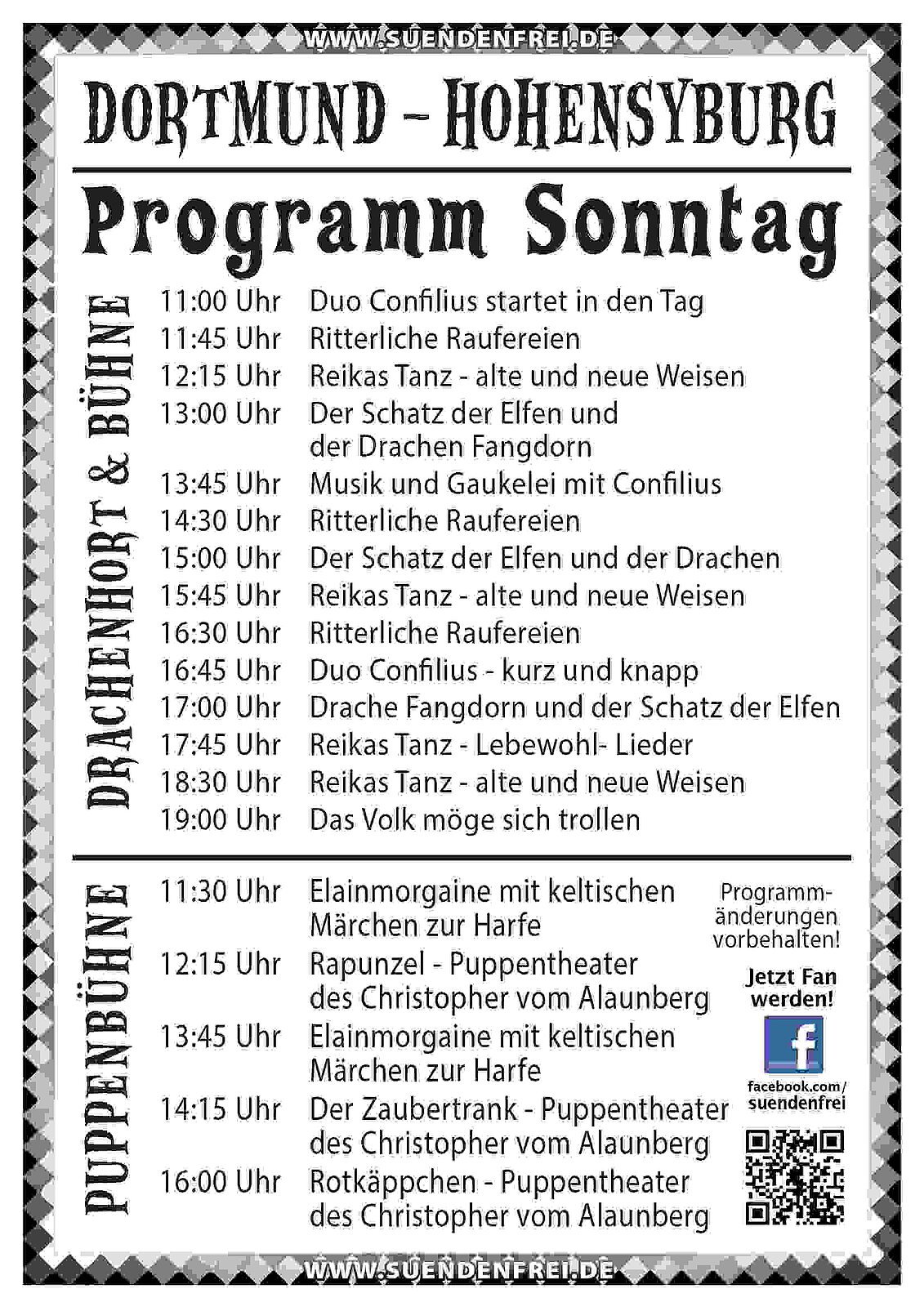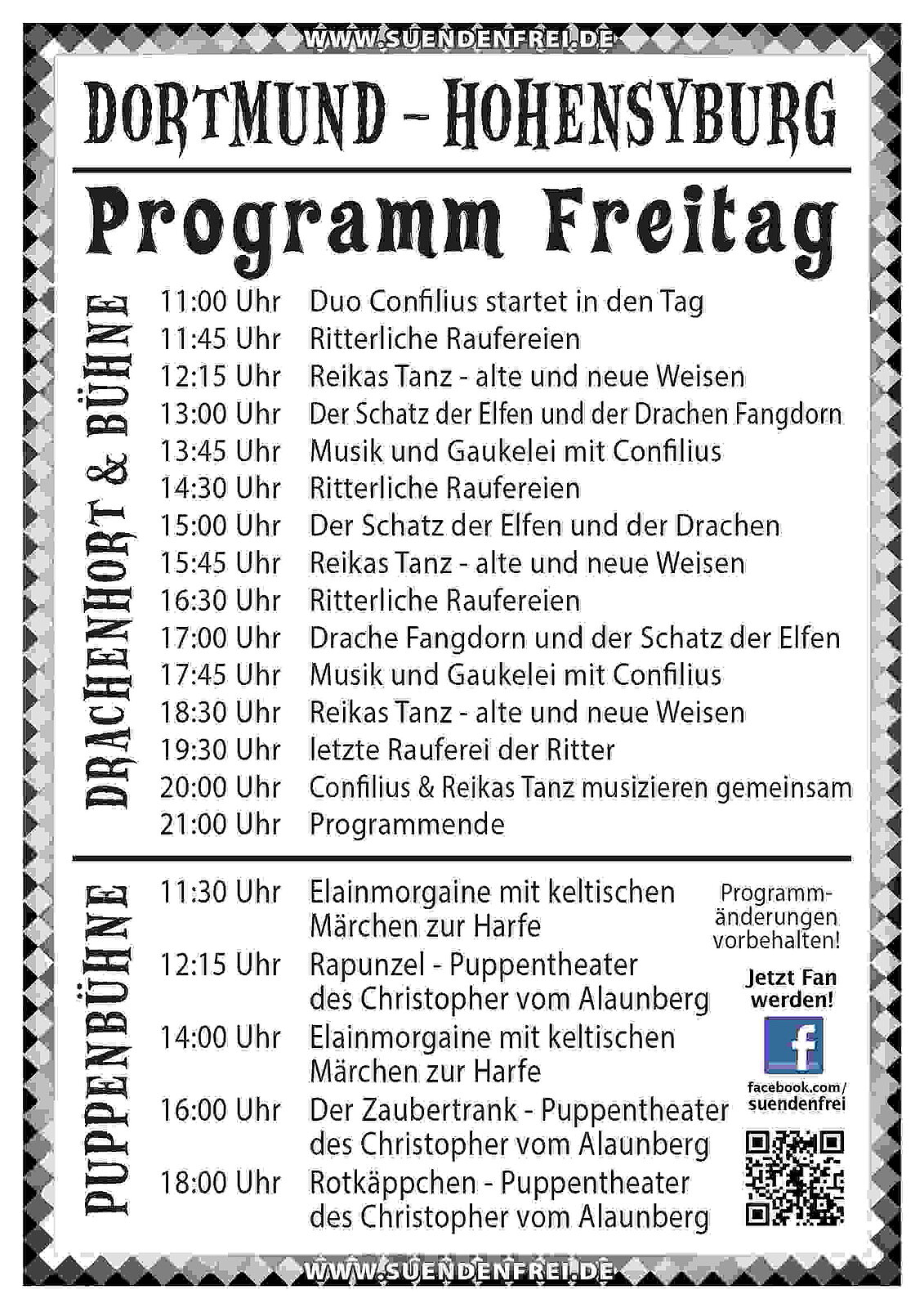 Auf einer Bühne erklingen feine Weisen aus dem Elfenland und aus dem Mittelalter, Das Programm gestalten die Spielleute von "Reikas Tanz", Puppenspieler André, gennnat der Findelkasper, Ritter raufen sich ab und an und für Kinder gibt es allerhand Mitmach- und Spielstände und Karussells. ElainMorgaine aus dem mythischen Lande Keltia erzählt mehrmals am Tag keltische Märchen und Mythen mit Harfenbegleitung und Gesang.