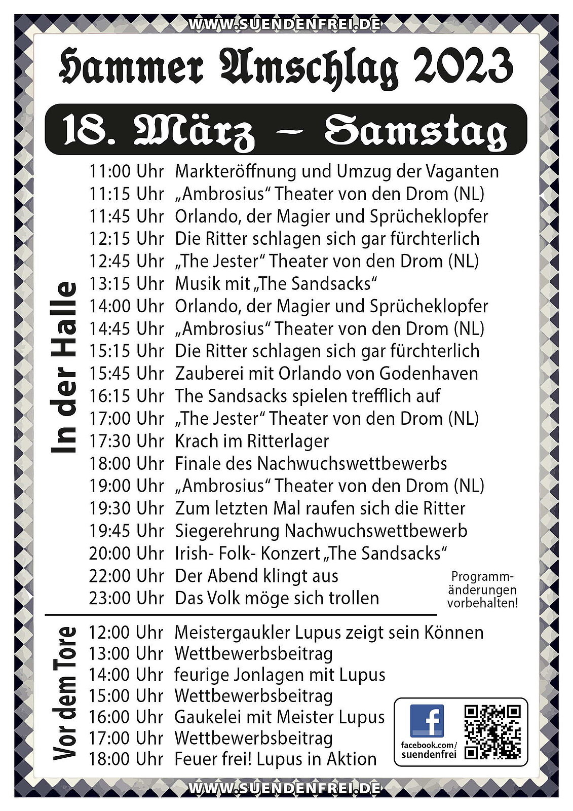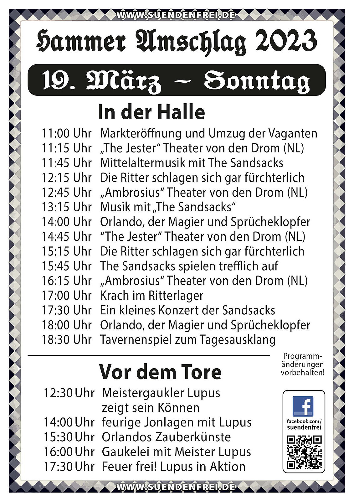 Auf der Bühne in der Halle, zwischen Tischen und Bänken und auch im Freien vor der Tür bei gutem Wetter treten Gaukler und Musikanten der Szene auf und beweisen, dass sie ihr Publikum auch nach der Winterpause trefflich unterhalten können. Mit im Programm sind unter anderem Gaukler Lupus, die Spielleute "The Sandsacks", die tagsüber mittelalterliche Musik spielen und abends auch ein Irish- Folk- Konzert geben und natürlich die streitenden, sich prügelnden Ritter, die im Kinderprogramm auftreten.