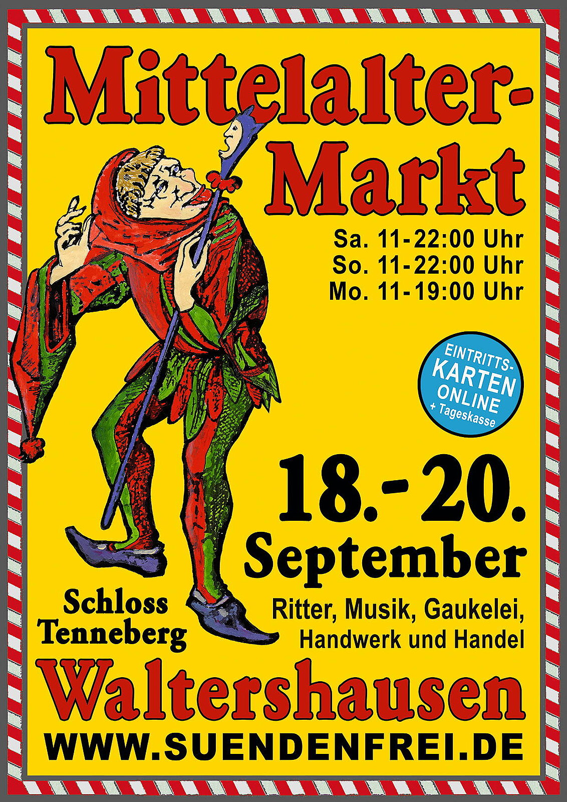Im Schloss, auf dem Vorplatz und im Burggraben werden etwa 30 Handwerker, Krämer und Wirte Platz finden und einen Markt abhalten. Farbenfroh, vielfältig, amüsant und historisch.