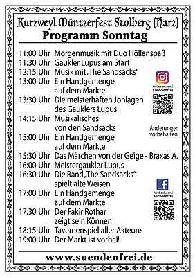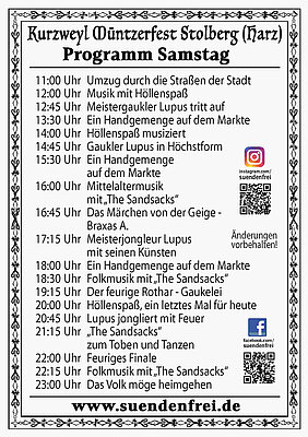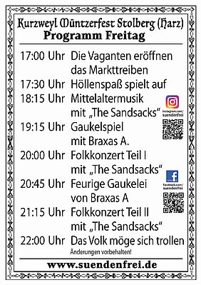 Im Geburtsort Stolberg, der malerischen Fachwerkstatt im Harz, dürfen sich die Gäste aus nah und fern auf ein dreitägiges Spektakel freuen. Mit dabei unter anderem die Folk- Band "The Sandsacks", Duo "Höllenspaß", Meistergaukler Lupus, Kinderprogramm mit Braxas A. und Feuer-Fakir- Spezialist Rothar.