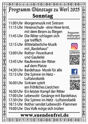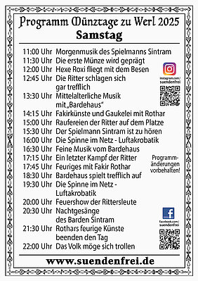 Zwei Tage lang erinnert die Stadt Werl an die Zeiten, als das Salz die Stadt reich machte und man sogar eigene Münzen herstellen durfte. In diesem Jahr wird das Prägen der Münzen am Brunnen von einem mittelalterlichen Markttreiben begleitet. Handwerker, Krämer und Mundschenke bauen ihre Hütten und Zelte auf und bieten ihre Waren und Dienstleistungen an. Zusammen mit Speis und Trank und einigen Attraktionen für Kinder wird es ein Jahrmarkt wie vor 500 Jahren.
