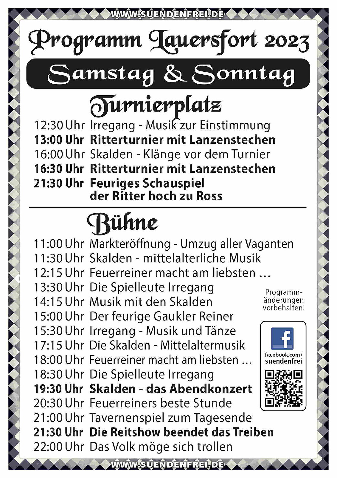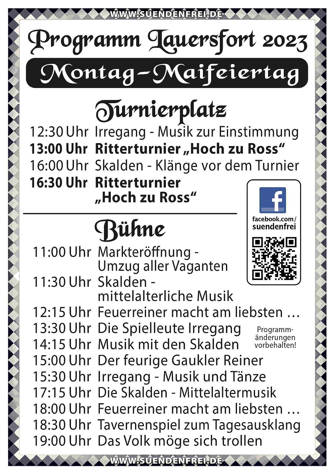 Herbei eilen die letzten Ritter der Erdenscheibe, um sich zwei Mal am Tage im Lanzenstechen zu duellieren. (13:00 und 16:30 Uhr). Das Turnier wird begleitet von einem Markttreiben mit Handwerk und Handel aus der guten alten Zeit. Mittendrin eine Bühne und auf ihr spielen Musikanten namens "Irregang" und "Skalden". Gaukler Tamino zeigt seine Künste und Jonlagen. Für die Abendstunden am Samstag und Sonntag versprechen wir feurige Eindrücke, erzeugt bei einer Feuer- Reitshow, die um 21:30 Uhr (außer am Montag) den Abend ausklingen lassen wird.