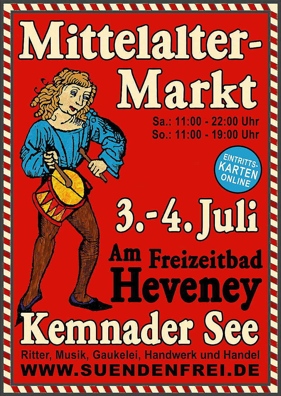 Ritterzelte und Marktstände soweit das Auge reicht! Die Wiese am Freizeitbad Heveney ist riesig und bietet zur Pandemiezeit ausreichend Platz, mit genügend Abstand im Mittelalter bummeln zu gehen. Gaukler und Musikanten sorgen zwischen Tischen und Bänken für Unterhaltung, die Ritter prügeln sich ab und an und an den Ständen gibt es Dinge zu kaufen, die man für den Alltag - nicht nur im Mittelalter - gebrauchen kann.