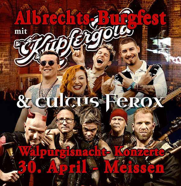 Zur Walpurgisnacht am 30. April ab 18:00 Uhr präsentieren wir gleich zwei Spitzenbands der Mittelalterszene, "Kupfergold" und "Cultus Ferox". Hinzu kommen einige zornige Walpurgis- Hexen und Teufel und eine Feuershow gegen 22:00 Uhr. Das Ganze diesmal ohne großes Markttreiben, da ein Teil des Geländes durch Baumaßnahmen nicht zur Verfügung steht. Dafür mit einem unterhaltsamen Mittelalter- Musik- und Showprogramm bis Mitternacht.