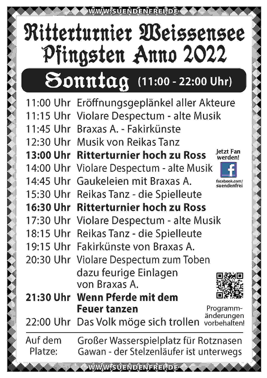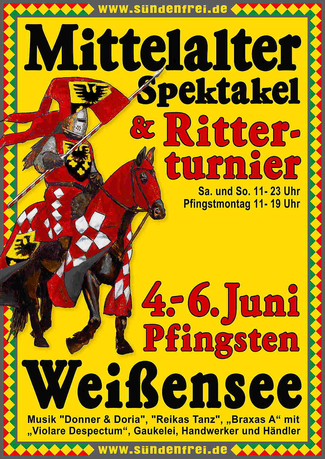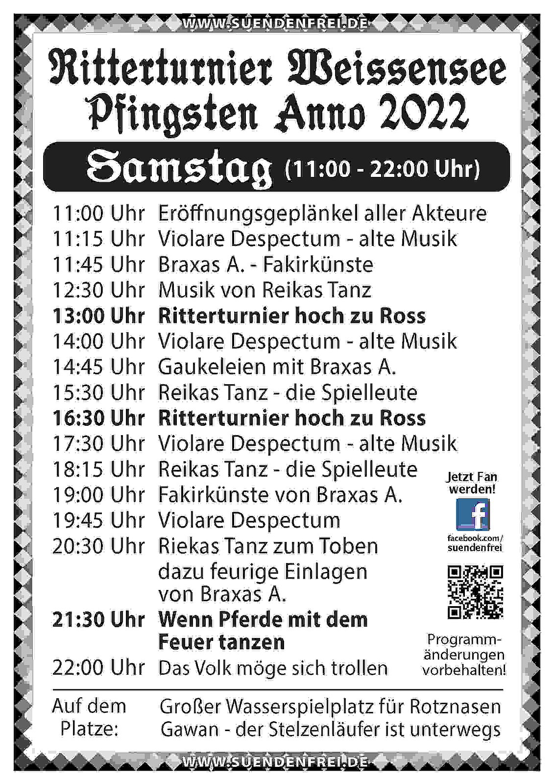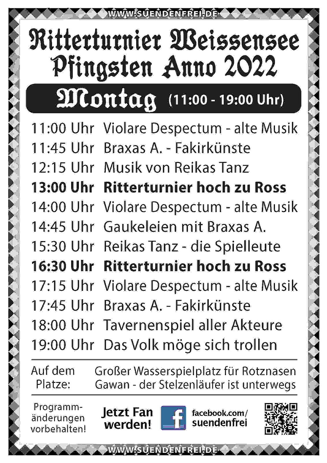 Zwei Mal am Tage reiten die edlen Ritter mit ihren Lanzen und Schilden in ein zünftiges Turnier. Am Samstag- und Sonntagabend kommt eine Feuer- Reitshow bei Nacht hinzu.Abends gibt es Konzerte und Feuershows, tagsüber kurze Bandauftritte und Gauklerspiele, dazu jede Menge Brimborium an den Ständen. Jubel, Trubel und Heiterkeit - wie es sich für ein Pfingsfest gehört!