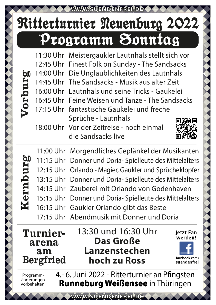 Die berühmte Burg an der Unstrut steht zwei Tage lang im Zeichen des Mittelalters. Man trifft alte Bekannte, die Haudegen von Wenzels Ritterspielen, die Musiker "Donner und Doria" und "The Sandsacks", Gaukler Orlando von Godenhaven, Puppenspieler, Ritter, Burgfrauen und Artisten. Handwerkerstände, Spielstationen, Karussells, Krämereien und Speis und Trank - Euch erwartet ein facettenreiches Markttreiben in der ganzen Burg.