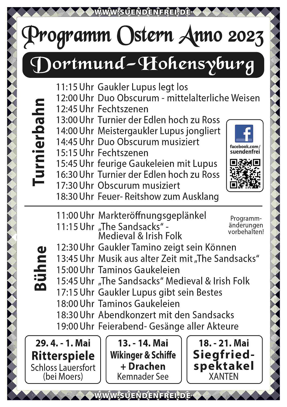 Zwischen den Reitshows dürfen sich die Gäste aus nah und fern über facettenreiche Unterhaltung freuen. Gaukler, Spielleute und Minnesänger treten auf. Fröhliche Musikanten wie die "The Sandsacks" und "Duo Obscurum" spielen auf der hölzernen Bühne ihre Melodien aus alter Zeit und Gaukler wie Lupus und Tamino geben ihr Bestes. Ein mittelalterlicher Markt mit vielen Ritterzelten, Handwerkerständen und Gastronomie entsteht und es wird gehandelt, gearbeitet und beköstigt wie vor 600 Jahren.Ein Osterspaziergang ins Mittelalter, zu dem wir jung und alt herzlich einladen.
