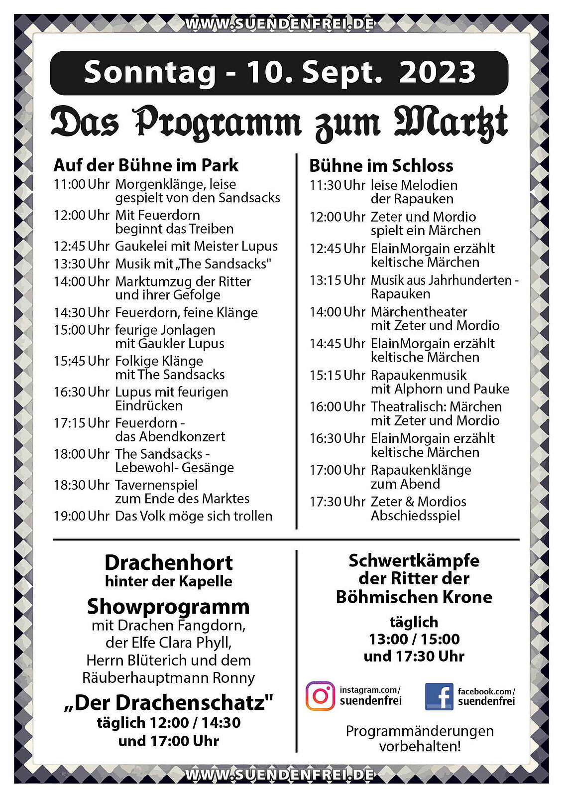 Auf verschiedenen Bühnen im Umfeld agieren Gaukler, Possenreißer, Puppenspieler und Spielleute. Mit dabei sind unter anderem die Bands "The Sandsacks", "Feuerdorn". "Hutprobe" und "Rapauken" sowie Gaukler Lupus und die Märchenerzählerin ElainMorgain.Zwei Wikingerschiffe liegen im Wasser und bieten kostenlose Fahrten über den Schlossteich an. Baumeister Sven stellt für die Jüngsten seinen Wasserspielplatz auf und am Samstagabend könnt ihr während der Konzerte verschiedene Feuershows der Künstler bewundern.