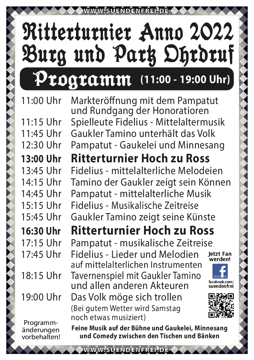 Mit einem Lanzenstechen hoch zu Ross starten wir in die Saison Anno 2022. Ein Wettkampf, Mann gegen Mann, bei dem es am Ende nur einen Sieger geben kann. Zwei Mal am Tage (13:00 und 16:30 Uhr) dürfen sich unsere kleinen und großen Gäste auf ein Ritterturnier freuen. Dazu gibt es einen passenden Mittelaltermarkt mit Handwerk, Handel, Karussell, Spielen und Speis und Trank.